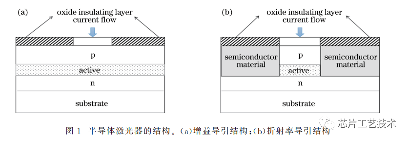 寬條形結構是大功率激光器常用設計,如圖b是常見的折射率導引結構的芯片結構。利用材料折射率差導引的結構不僅對注入電流和載流子的側向擴散有限制作用,還能夠限制光場的側向滲透.所以折射率導引機制能夠有效降低器件的閾值電流,同時有源區產生的熱量能夠向周圍的無源區散失,保持器件的熱穩定性。