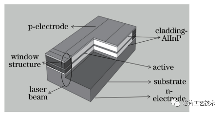 影響激光器功率提高的主要因素是腔面災變性光學損傷(COMD).COMD 主要發生在激光器的出光腔面上,在輸出功率較大時,腔面的光功率密度增大,當 AlGaInP激光器的腔面功率密度達到1~5MW/cm2時,激光器腔面處的缺陷數量就會不斷增加,并向內部遷移,導致激光器發生 COMD,輸出功率急速下降.研究人員經過大量的理論分析和實踐探索,發現在激光器腔面制作非吸收窗口結構可以有效抑制 COMD現象。通過快速退火的方式將 Zn作為雜質擴散到有源區,Zn擴散加強了 AlGaInP 自然超晶格的無序性,也增加了擴散區量子阱的能帶寬度.而有源區以外帶隙寬度較小的區域無法吸收振蕩的激光,稱為窗口區.非吸收窗口的出現大大降低了整個發光區的溫度,有效抑制了 COMD現象.下圖為帶有窗口結構的半導體激光器.