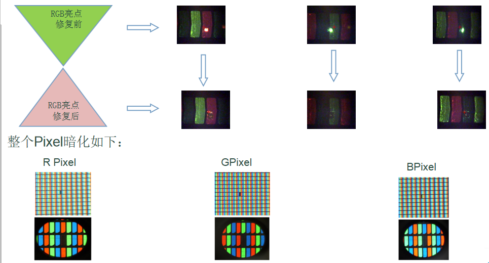 超快激光亮點修復特點:可以直接針對一個pixel里的異物亮點進行單獨暗 化修復,而不影響周圍區域發光。